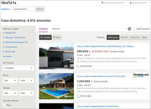 Las casas domóticas o inteligentes empiezan a ser cada vez más comunes en la oferta del mercado inmobiliario español. Tanto es así que empresas del mercado inmobiliario como Idealista promueven la domótica ofertando áticos con control de luces o chalets con sistemas de domótica integral para que potenciales compradores puedan ver casas a la venta con funcionalides domóticas.