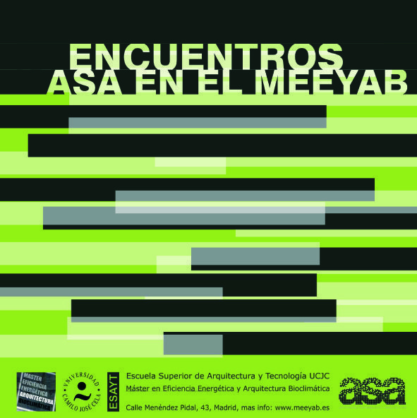 ASA participa por tercer año consecutivo en el Máster de Eficiencia Energética y Arquitectura Bioclimática (MEEYAB) de la Universidad Camilo José Cela en Madrid. Nuestra participación consiste en la impartición de una asignatura de 3ECTS (Introducción, Antecedentes y estado actual de la cuestión) organizada en torno a una serie de cinco encuentros. Cada uno de ellos se organiza desde la participación de miembros e invitados de la asociación, organizados en grupos de tres y ofreciendo una charla de unos 20 minutos cada uno y posterior debate con los demás ponentes y los alumnos.